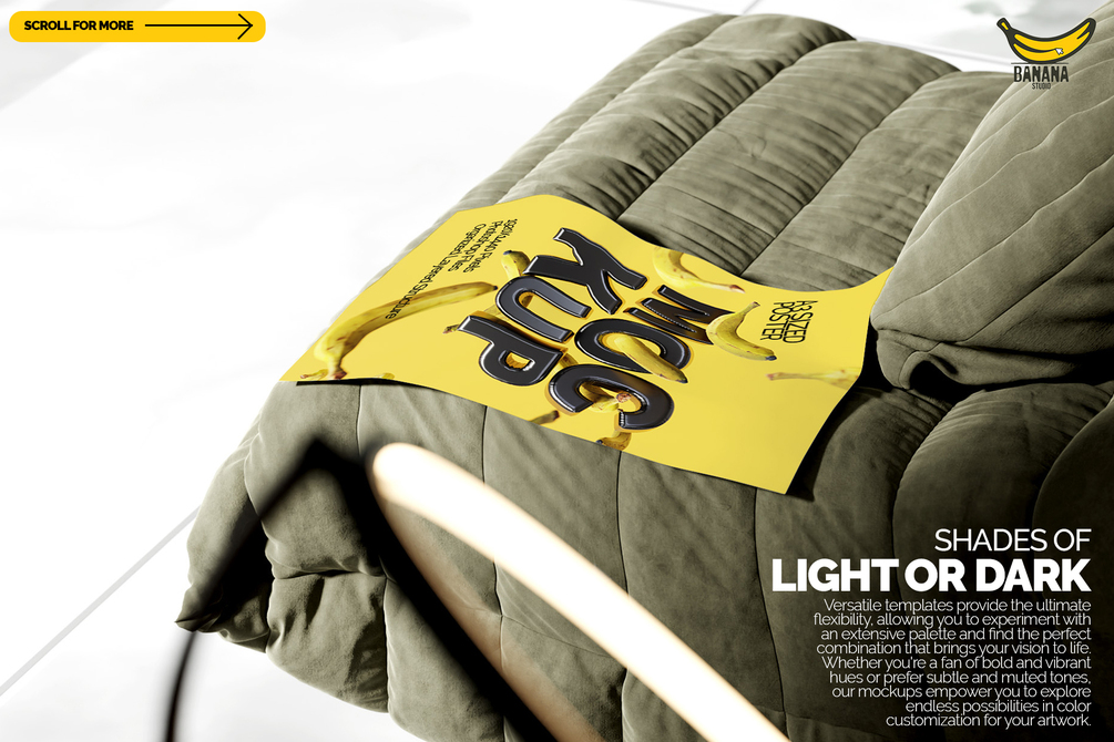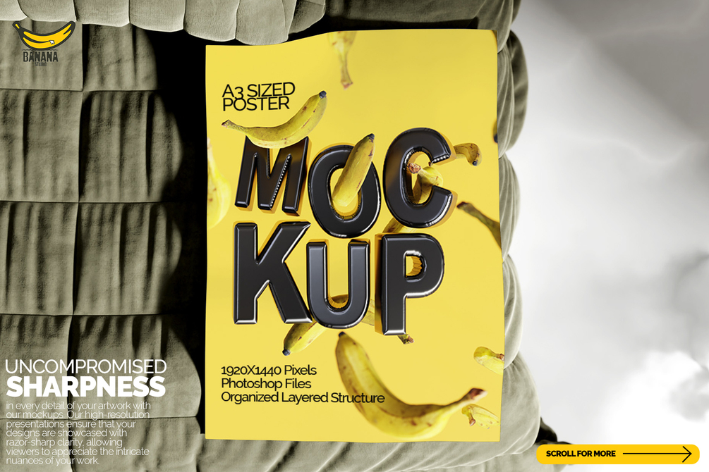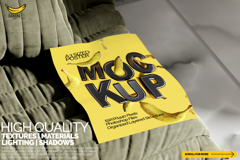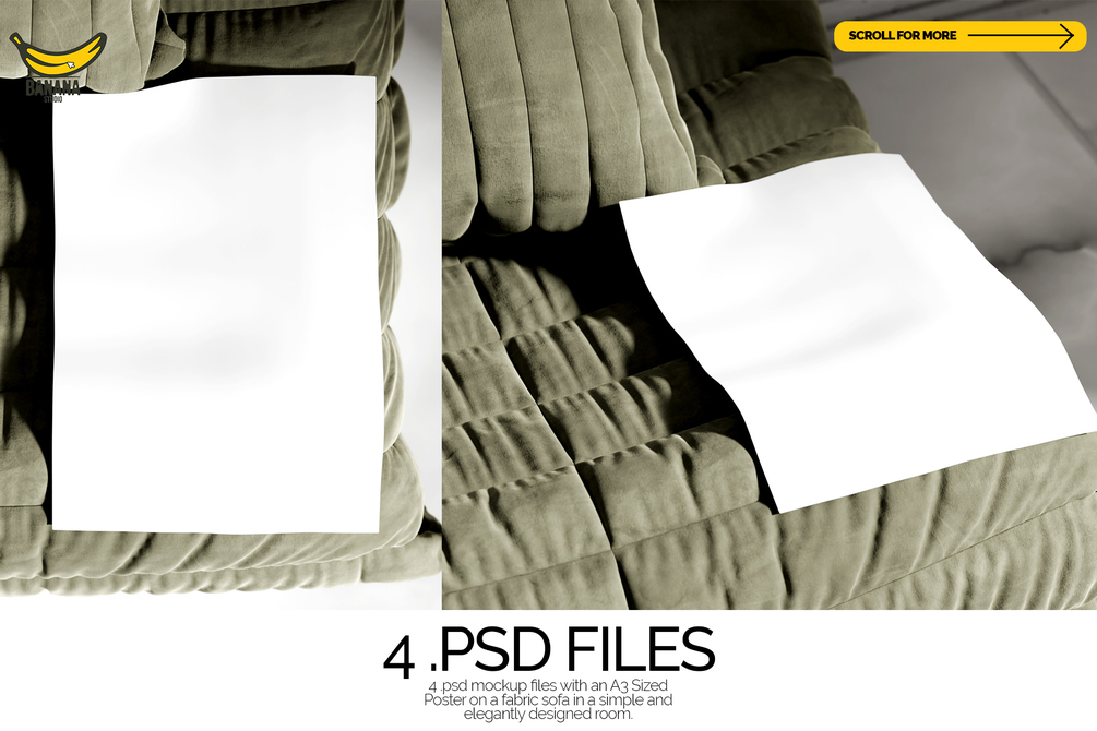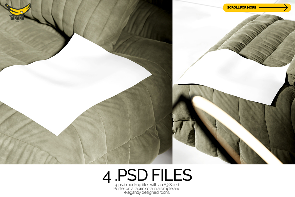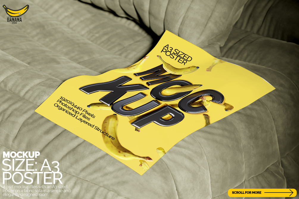 Command attention with our A3 size paper poster mockup laid on the sofa. With 4 .psd files capturing every detail in 1920x1440 pixels, this mockup provides a stunning backdrop to showcase your designs with style and flair.
