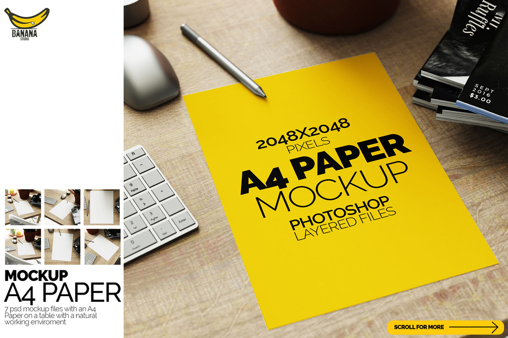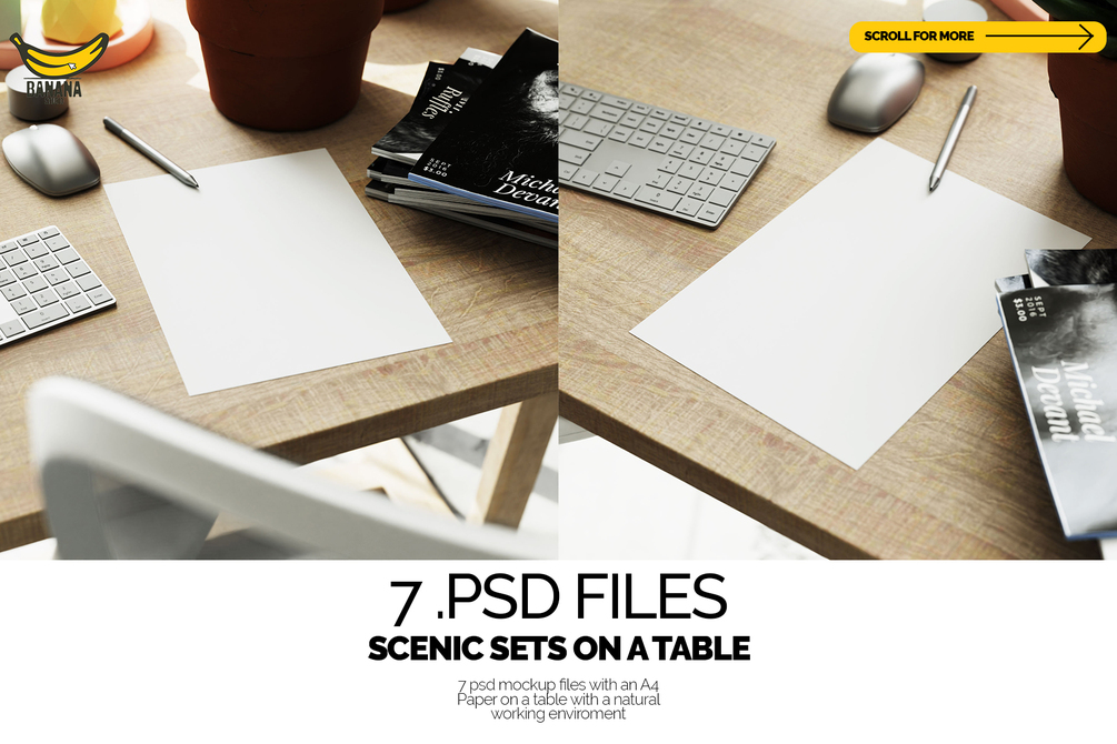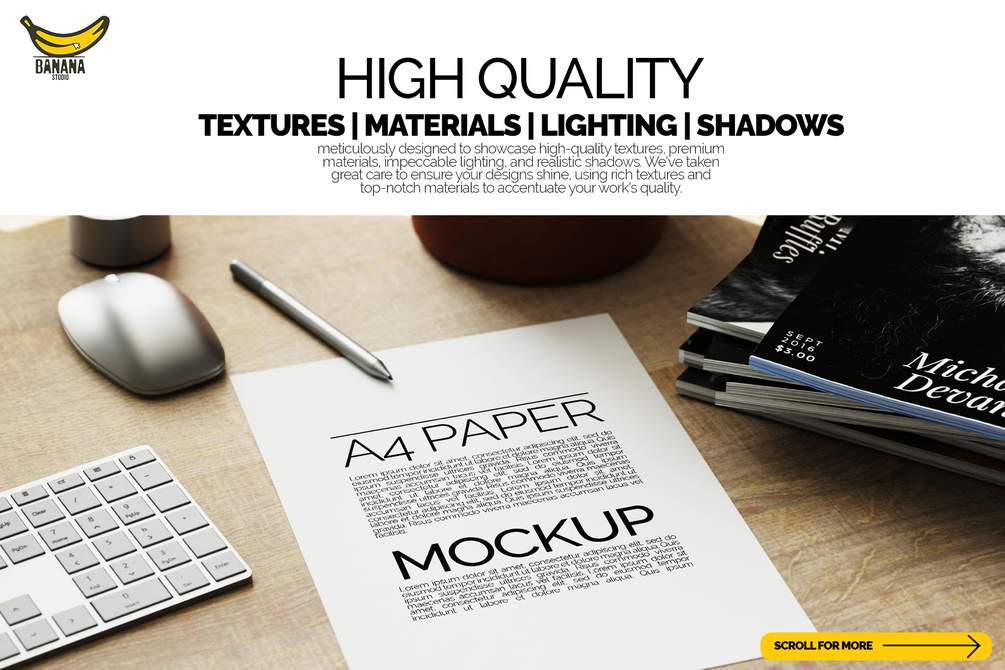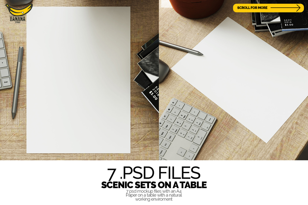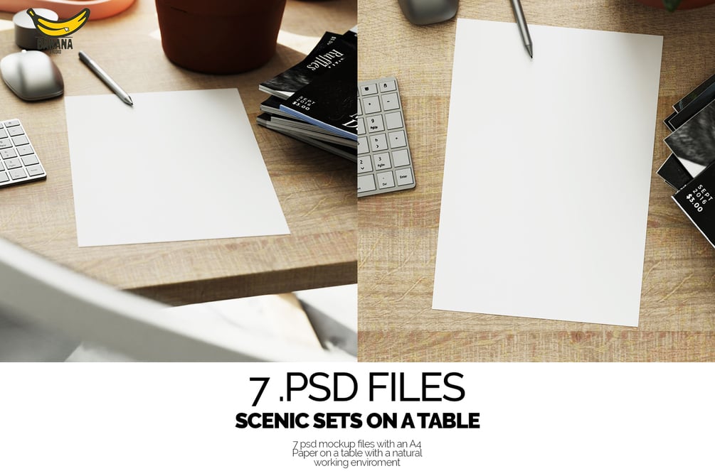 Introducing our A4 Paper Mockup Set — a sophisticated addition to your design toolkit. This collection features a realistic studio-like room setting, complete with a stylishly arranged table showcasing essentials like a pen, paper, mouse, keyboard, and a steaming cup of coffee. Elevate your presentations with these meticulously crafted mockups, offering a perfect balance between professionalism and creativity. Ideal for showcasing your designs in a real-world context, this set is a must-have for designers and businesses alike. Grab this versatile A4 Paper Mockup Set and bring your projects to life with a touch of elegance.