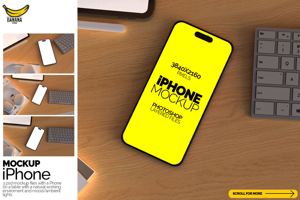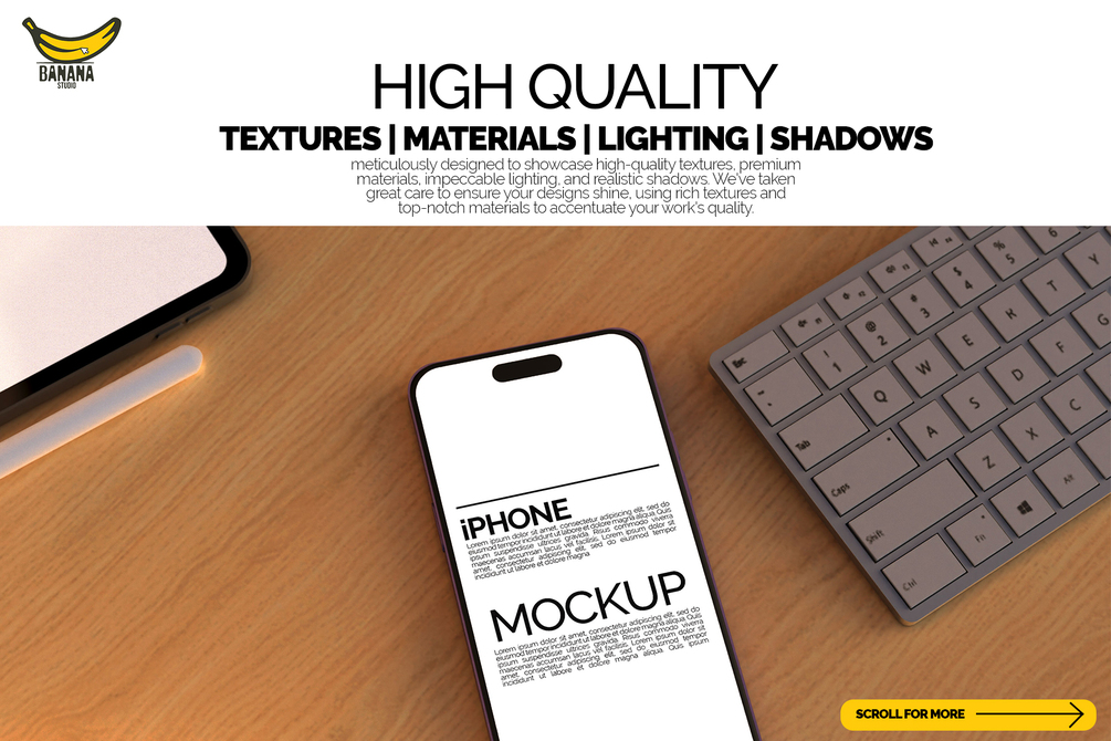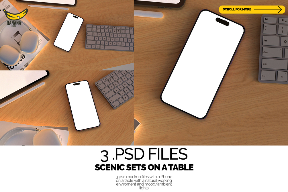 Immerse your designs in our iPhone Screen Mockup Bundle, carefully staged in a moody scene. This set features a captivating desk setup with ambient mood lights, creating a visually stunning backdrop for your presentations. With carefully arranged accessories, this bundle is designed to elevate your projects, making it an ideal choice for designers seeking a sophisticated and atmospheric showcase.
