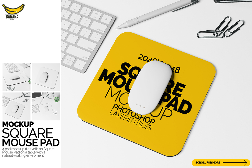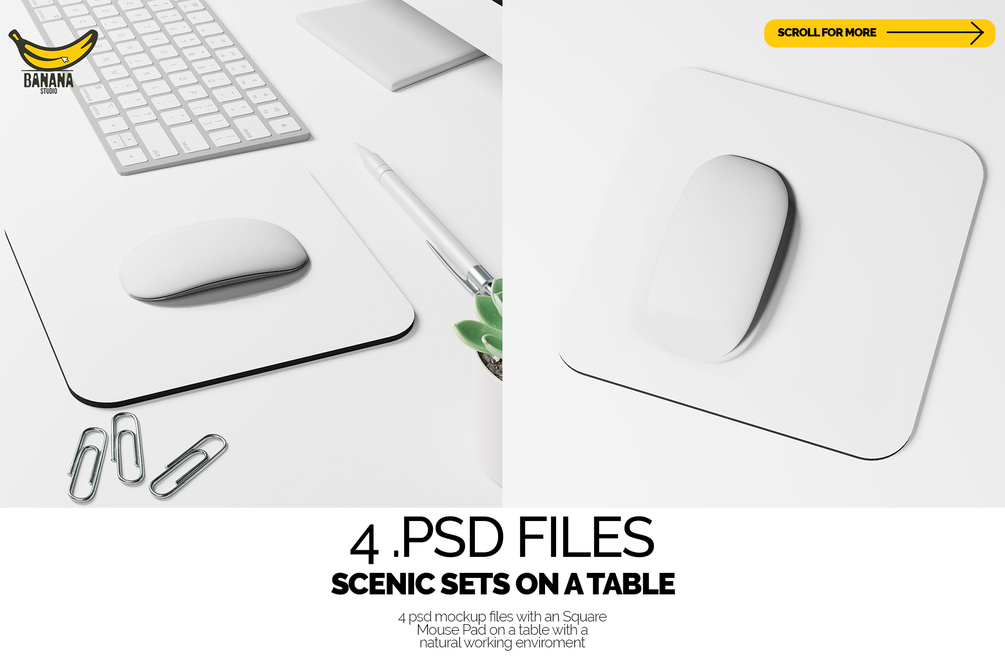 Transform your workspace media with our Square Mouse Pad Mockup Set. This versatile collection features a sleek white office desk adorned with essential accessories—paper clips, keyboard, pen, monitor, and a touch of greenery. Elevate your presentation with this realistic and professional setting, perfect for designers and businesses looking to showcase their products in a sophisticated context.